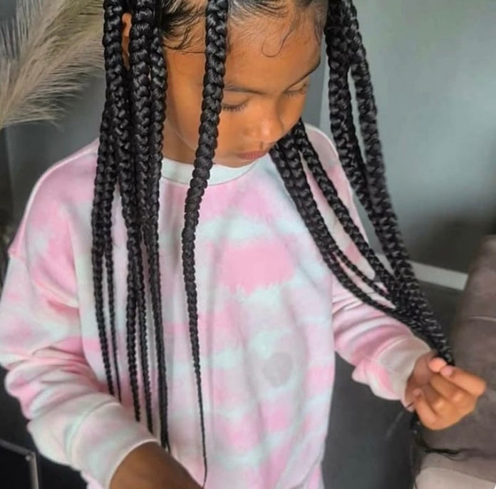 Child-friendly braids designed to be gentle, neat, and long-lasting. Choose from box braids, knotless, corn rows with or without extensions.
